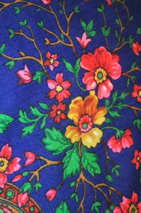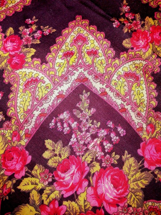 Платок маленький - стороной 88 см, даже не 89 см. На нём никаких опознавательных знаков. Этикетку я помню, была обычная белая, бумажная, вшитая в кайму оверлоком. На ней было написано, что это Павловопосадская фабрика. Ему лет столько, сколько мне, и куплен мамой для меня, и куплен он году в 1978 примерно. Может, и позже, но не позднее 1979 года. Был очень дорогим, несмотря на маленькие размеры. Когда я доросла до него, а было это, когда мне стукнуло 16 лет, то на второй же день я прожгла его на кухне: от спички отлетела искра. На платке видны крошечные ожоги, размером с пылинку. Мама рассердилась и отняла его и спрятала туда, где он лежал шестнадцать лет. Затем, года в 23, опять я до него добралась, и тут мама была бессильна: я его закалывала при помощи янтарной брошки. От этого тоже остались три крошечные дырочки. Вот если бы не это, можно было бы сказать, что платок выглядит, как новый. При своей яркости цвета спокойные. И всего пять красок на нем. А эффект... Я убеждена, что он кисти Слащёвой. Я его сама для себя называю "Мини-Финифть". Не сочтите за самоуверенность, а вглядитесь в эти розы...