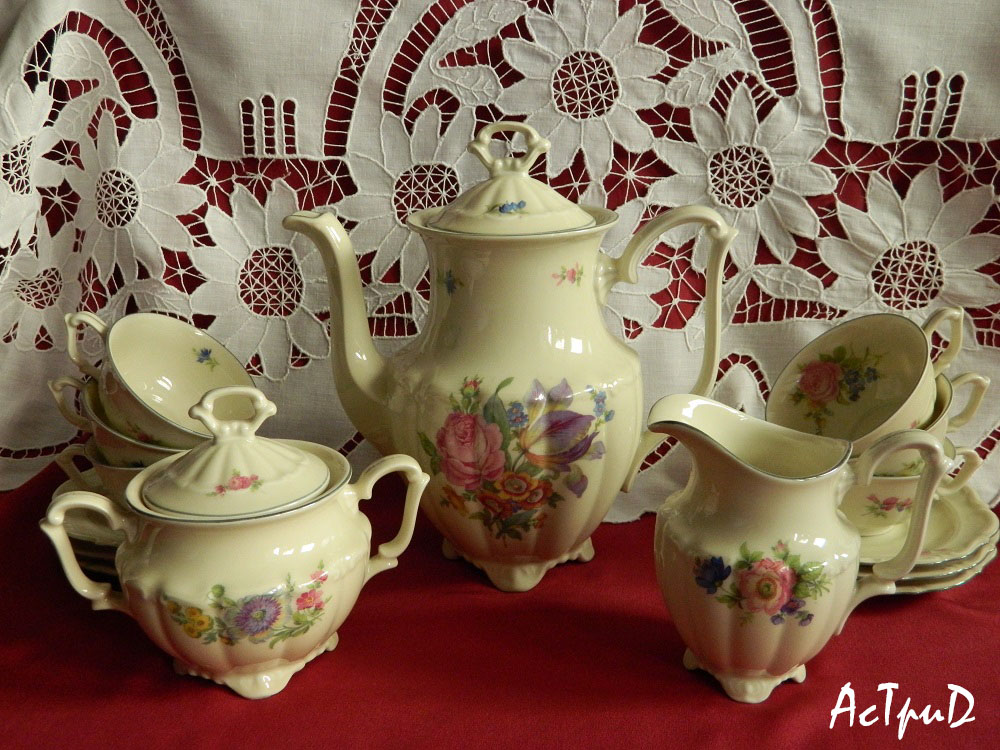 AcTpuD, очень красивые оба ::P ! А на пастельном и цветы-букеты разные, такие нежные и милые, очень гармоничный сервиз. Если это наследство, то посуда несовременная? Из какого примерно времени и откуда? На донышках клейма есть... И очень красивый подзор, изумительная работа :: Спасибо, что показали такую красоту ^%