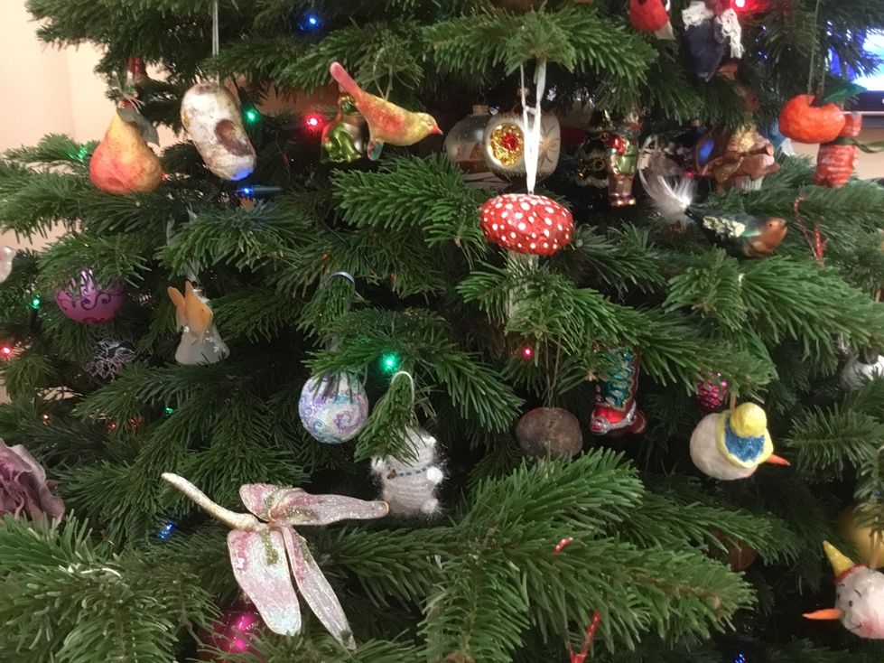 Покажу тоже ёлочку. Это ёлочка моей сестры, каждый НГ мы всей семьёй собираемся у неё дома. Игрушки на ёлочке разные: немецкое стекло, винтажные, а так же много сделанных моей сестрой, она сама делает очень красивые игрушки для ёлок и не только.