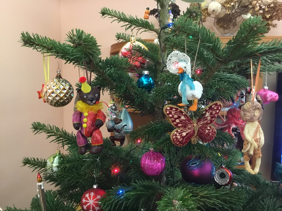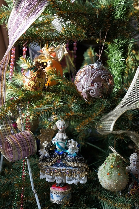 Покажу тоже ёлочку. Это ёлочка моей сестры, каждый НГ мы всей семьёй собираемся у неё дома. Игрушки на ёлочке разные: немецкое стекло, винтажные, а так же много сделанных моей сестрой, она сама делает очень красивые игрушки для ёлок и не только.