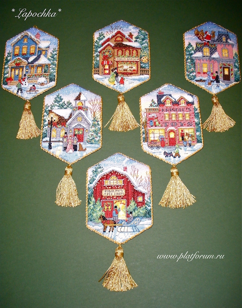Riga, рада что понравились игрушки ^% Это наборы для вышивки компании "Dimensions". Я не знаю выпускаются ли еще эти дизайны или нет, но при желании можно найти. Я только в игрушках "Рождественская деревня" добавила кисточки. Показалось, что с ними гармоничнее смотрится угловатая форма игрушек. В набор они не входят, отдельно покупала в магазине.