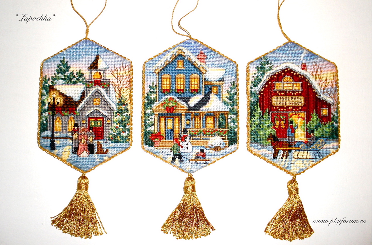 Riga, рада что понравились игрушки ^% Это наборы для вышивки компании "Dimensions". Я не знаю выпускаются ли еще эти дизайны или нет, но при желании можно найти. Я только в игрушках "Рождественская деревня" добавила кисточки. Показалось, что с ними гармоничнее смотрится угловатая форма игрушек. В набор они не входят, отдельно покупала в магазине.