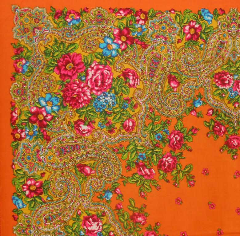 argon писал(а): Шаль порядка 150х150. Шерсть. Информация об этой шали публиковалась в кн. Макаровской. Считается, что это – рисунок 1950-х годов. Тогда же набивалась вручную. Отличается от шали Нежность лишь средником: в данном случае он традиционный, заполнен редкими штампочками-розочками. Кайма и средник красные, фон цветочой рамки оранжевый.