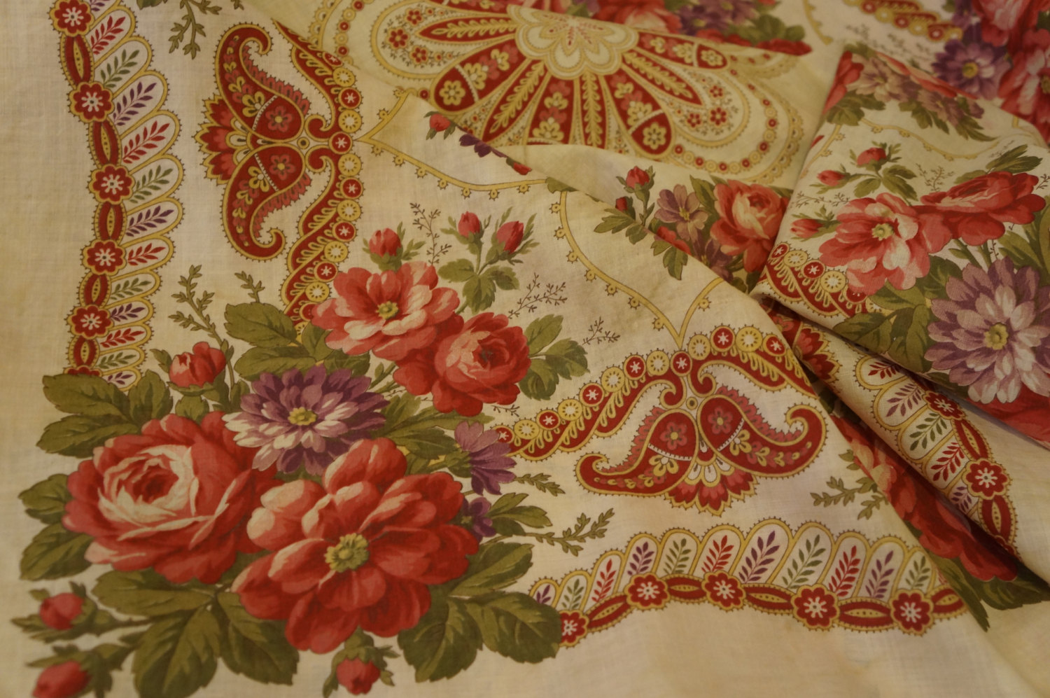 3). На хлопке в размере 83х83 с осыпкой (эта информация - со слов продавца; правда, продавец уже лет 10 успешно продает платки, поэтому, думаю, не ошибается и не врет. Тем более, что известно довольно много хб платков, печатавшихся в разных размерах).