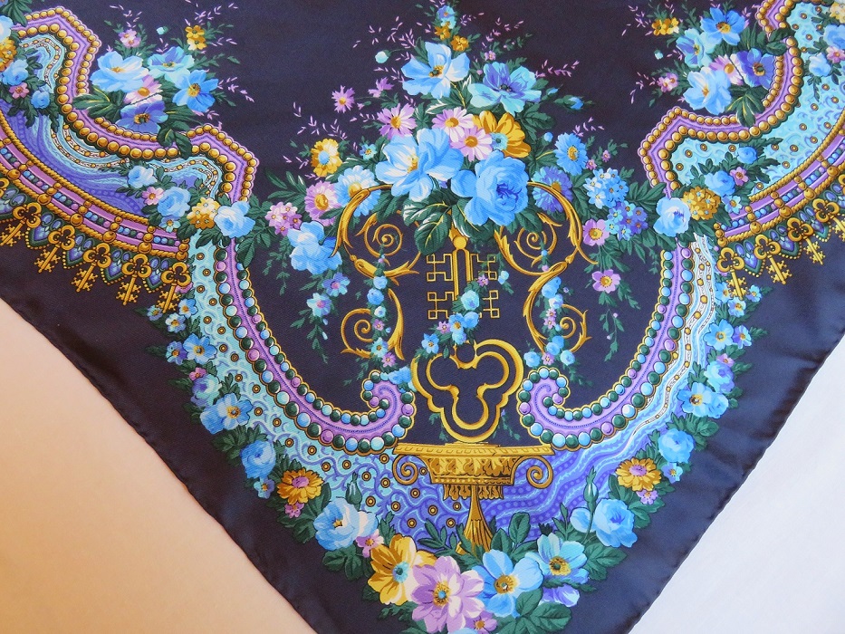 Шикарная цветовая гамма - на сине- сиреневом фоне яркие цветочные мотивы , чередующиеся с изображениями ключей. Ключи присутствуют практически на всех платках Corum."