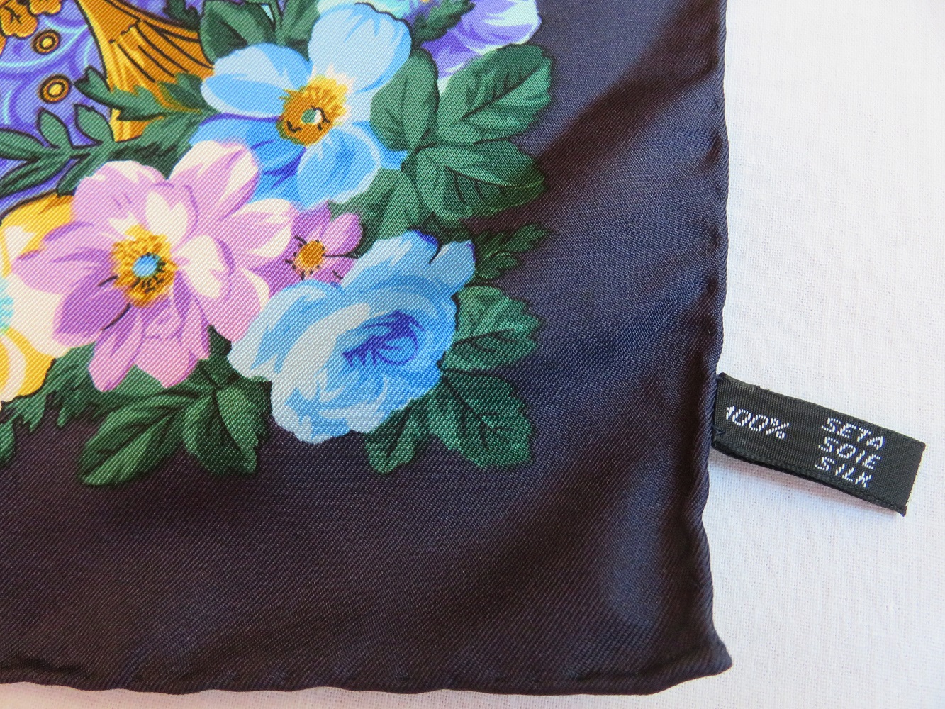 100% натуральный саржевый шелк. Качество, напоминающее знаменитые платки hermes. Отлично ложатся и драпируются. Естественно, роуль - ручная обработка края платка.