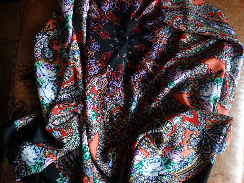Потом, как сказать, чтобы не было слишком высокопарно, но пусть -- упала в объятья платка "Утренний сад-2" 135см волшебницы Клары Зиновьевой. Ткань шелковистая, особенная (поэтому и стоит подороже). Фон тёплый (вспомнились мода и фильмы 50гг.), ближе к цвету топлёного молока. Рисунок тонкий, изящный. Глядеть на него -- сердце щемит, но так сладко-сладко! Если и не часто буду носить, то иногда -- непременно.