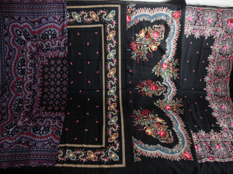 Покажу экзотический по колориту платок Вечерний 14. Цвет темно-лиловый, как на платках с грунтом 15. Цветы настолько яркие, что осмелится надеть далеко не каждая платочница. Но красив!! И ткань рокошная, с индексом "К"