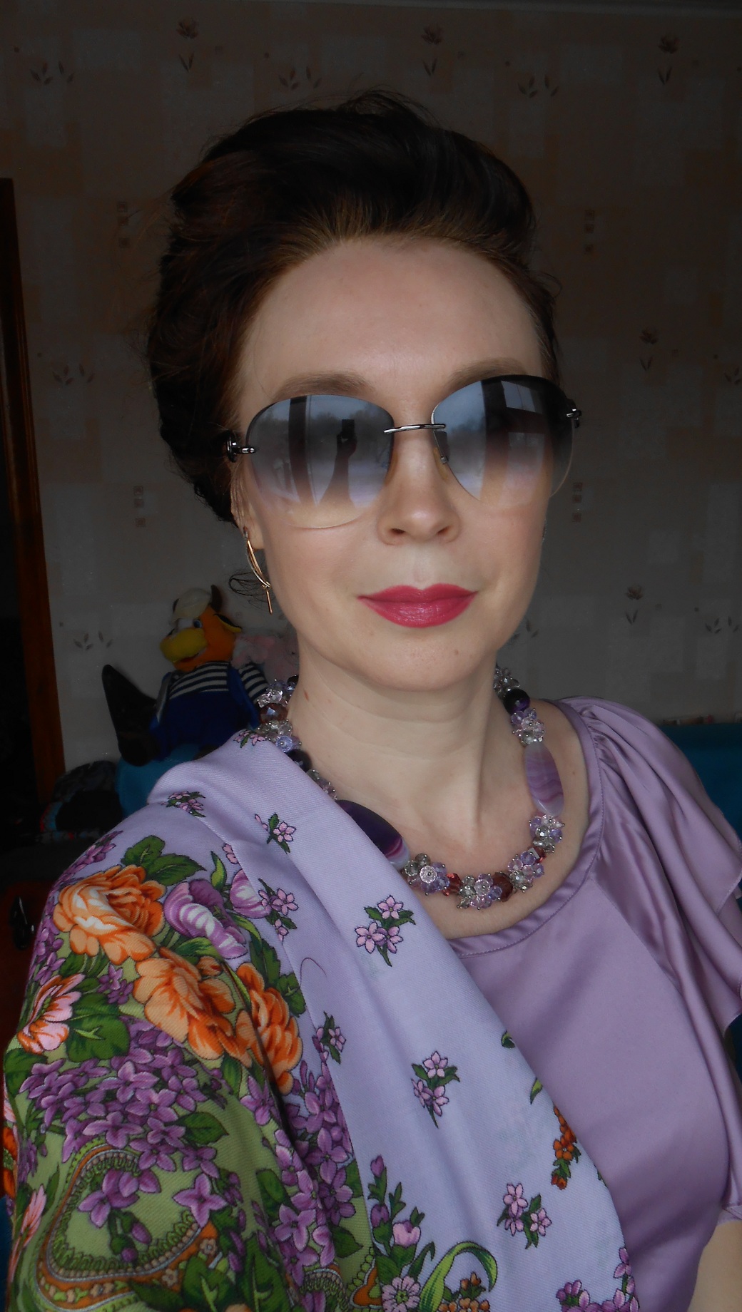 Сегодня получила оба колорита платка "Цветет сирень". Платки на достаточно плотной шерсти, ткань не шелковистая, скорее шершавая. Цвета яркие и печать хорошая. В целом платками довольна, но мне кажется что они требовательны к фону. Одела и пошла, не про них. ИМХО, конечно. 10 колорит обладает чудесной цветокоррекцией лица. Очень освежает и подсвечивает лицо такой оттенок сиреневого. Я правда, сегодня в образе, Л. Зыкиной, но может эти фото будут кому-то полезны. :)