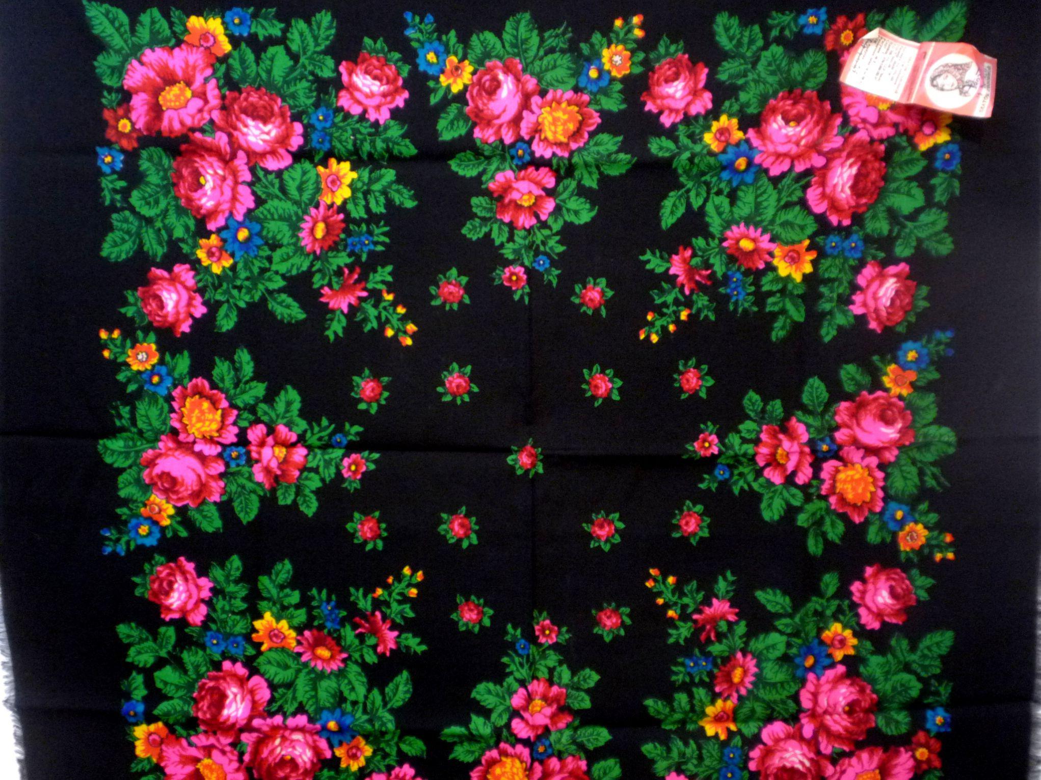 На просторах интернета нашелся платок, 90х90 см. Он произведен в Баку, сохранилась этикетка.