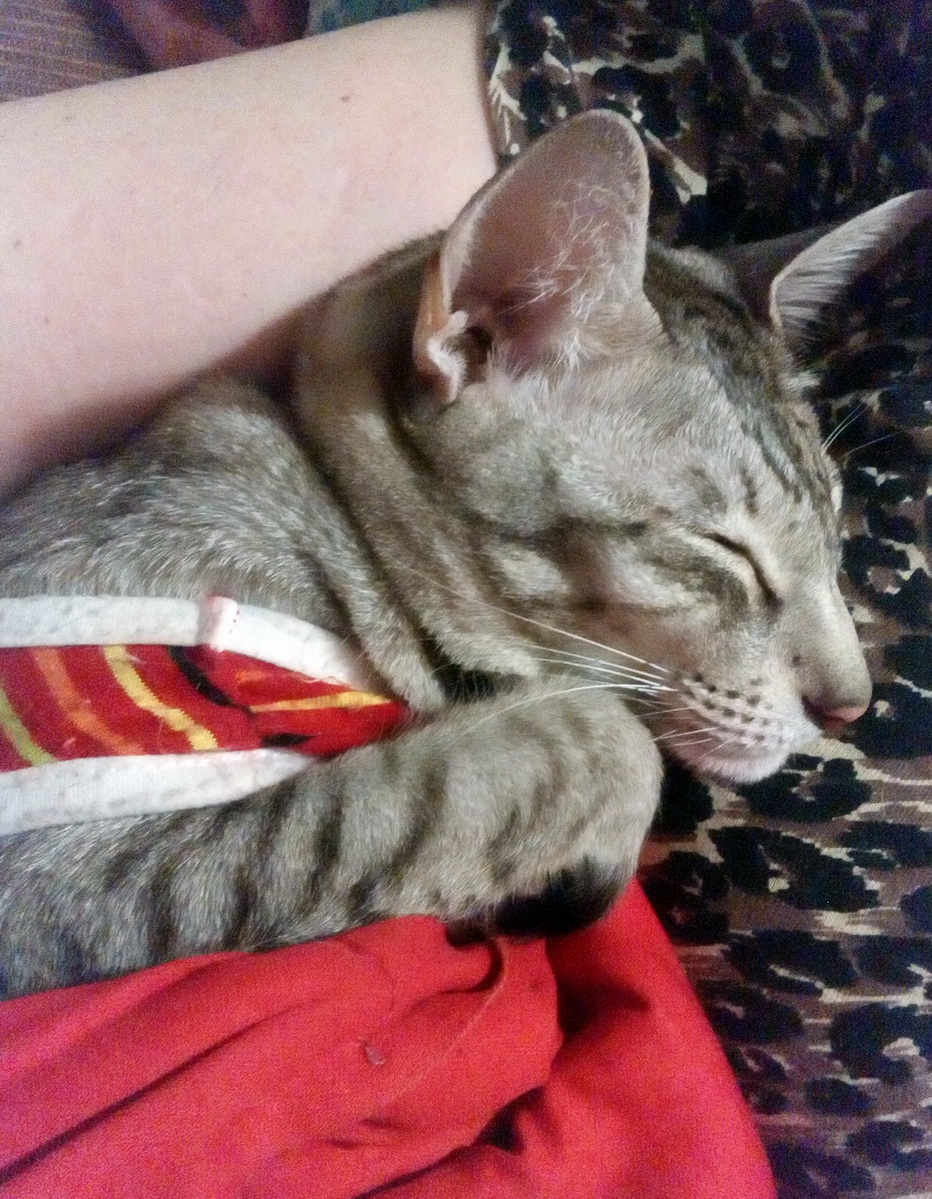 3 хвостик. Кошечка Машенька. Была подобрана в стоге сена в конце октября прошлого года, говорят она там мяукала 3 дня. Неделю шли дожди... и как раз в эту ночь передавали сильные заморозки. мы взяли этот маленький мокрый черненький комочек. Она была совсем крошечной, не умела кушать. была истощена. Мяукать уже не могла. Муж согласился взять ее так как оставить ее там означало убить. Так как пить она не могла я набрала молока в шприц, после первого миллилитра у нее так сильно забурчало в животике. Котеночек не отходил от меня ни на шаг, ее назвали моим хвостиком, даже когда я мыла посуду она вкарабкивалась на меня по одежде и даже 1 раз упала в мыльную воду. На лоток стала ходить раньше чем лакать из миски. Через какое то время я стала замечать у нее гнойные сопельки возле носа и хрипы в легких, мяукать она еще не могла, голоса не было. Понесла к ветеринару, сказали что у нее сильной воспаление легких. и назначили очень много уколов и прочих лекарств, котенку поставили возраст около 4х недель. Я тогда была в отпуске и носила ее каждый день на уколы, судя по ее поведению они были ужасно болючие, так как этот комочек даже рычал. Спала она у меня на плече. Мои кошки ее конечно очень долго не принимали, шипели, рычали, особенно Ксюша, хотя сейчас даже вылизывает ее. она наверно месяцев до 8 спала у меня на голове, а потом нам стало не хватать места на одной подушке и она стала спать между нашими с мужем подушками. изначально мы ее планировали отдать в добрые руки, но я так к ней привязалась, что на звонки отвечала, что котенок уже пристроен. Голос у Маши появился, но немного скриповатый, так смешно когда она со мной разговаривает. Мужу всегда кажется что она говорит мне "мама". Конечно кошечка покастная и егозистая но я ее очень люблю, как доченька она у меня
