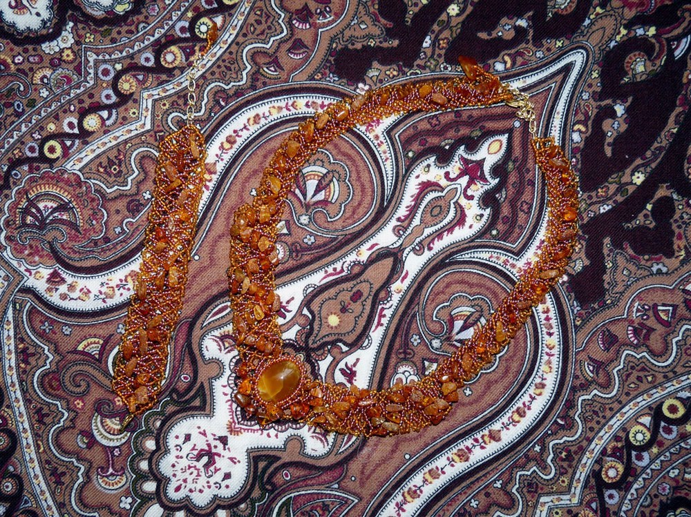 Давно хочу янтарное что-нибудь, но по разным причинам пока не судьба. Зато есть вот такое плетеное из бисера колье с янтарем и др камешками в тон