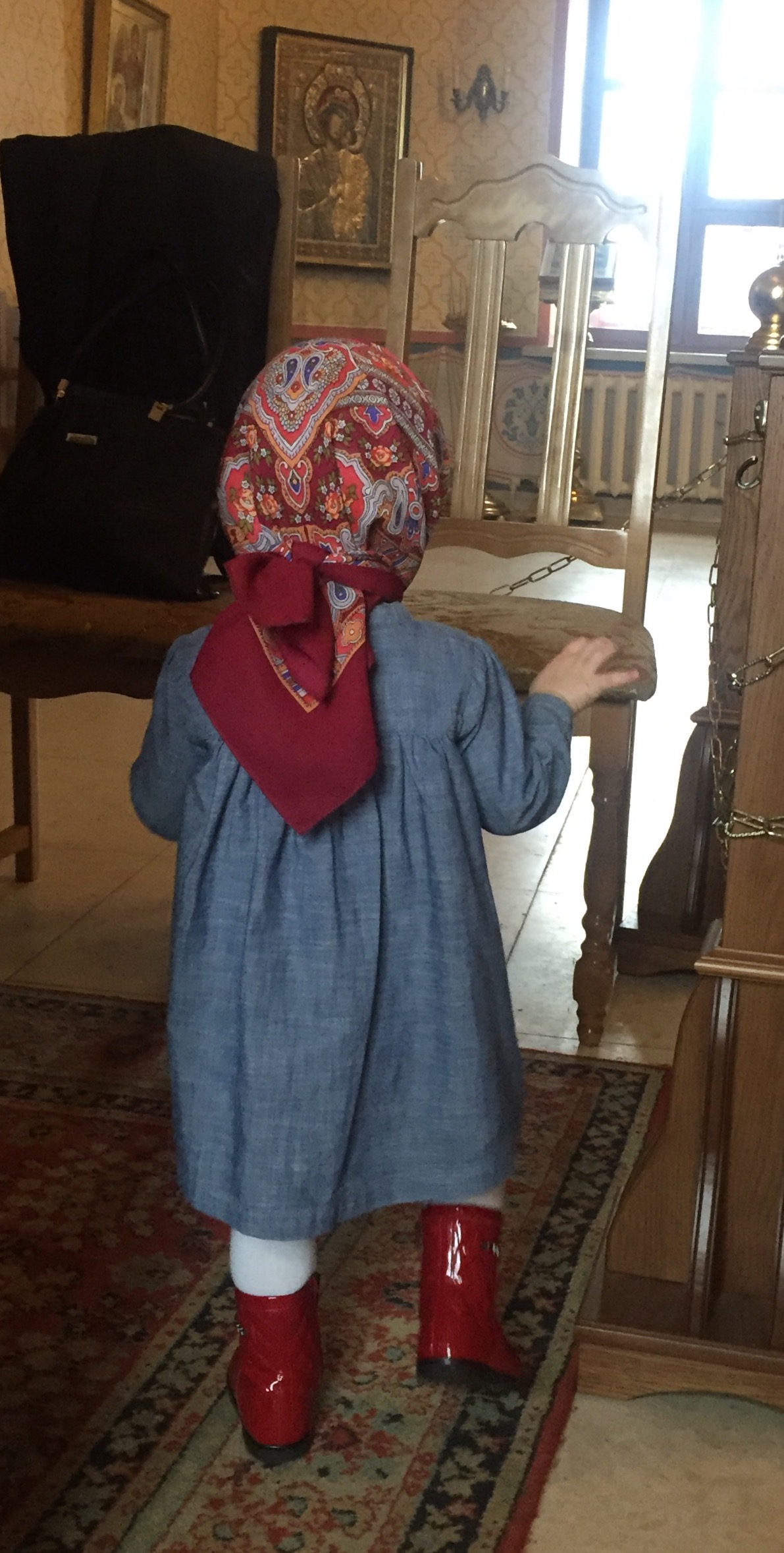 Внучка,добравшись до платков,шляпок и бранзулеток не мудрствует лукаво-одевает все и сразу.