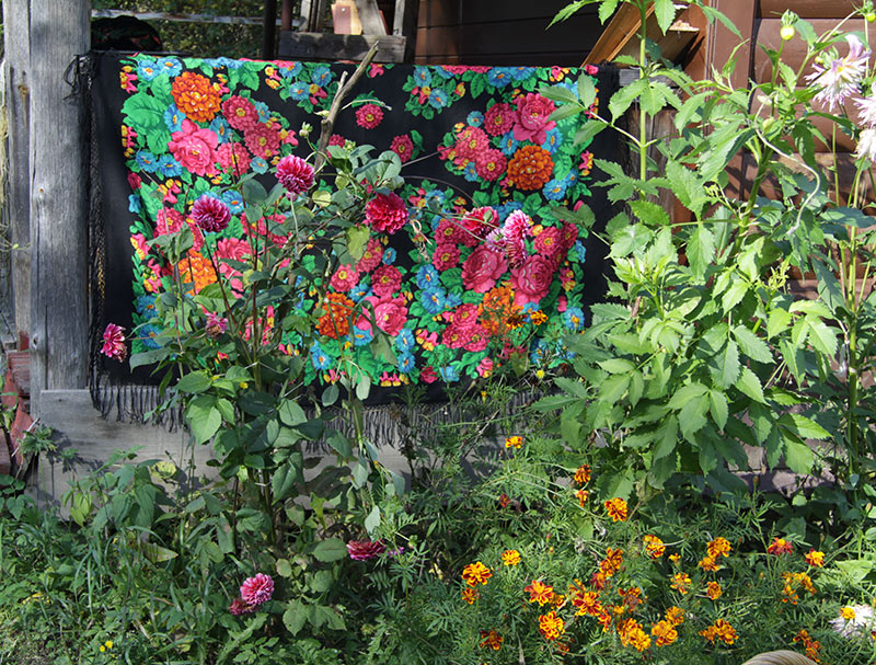 Чудесная, с фирменными колокольчиками-вьюнками Валентины Тараненко, радостная и немного наивная, такой платочный примитивизм в лучшем смысле этого жанра, действительно летний день. Мои попытки это передать к сожалению были осенью, все что нашлось, отцветающие георгины и немного бархатцев с календулой.