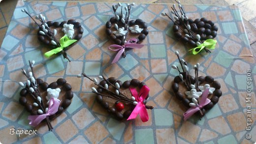 Магниты кофейные с элементами пластики и магниты цыплята (тоже детки делали)пластикой пользовались для создания яиц