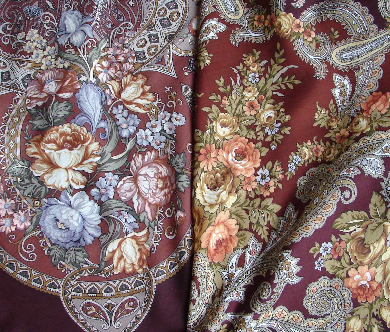 Почему-то на фото этот платок новой печати выглядит холоднее по оттенкам, чем в реальной жизни