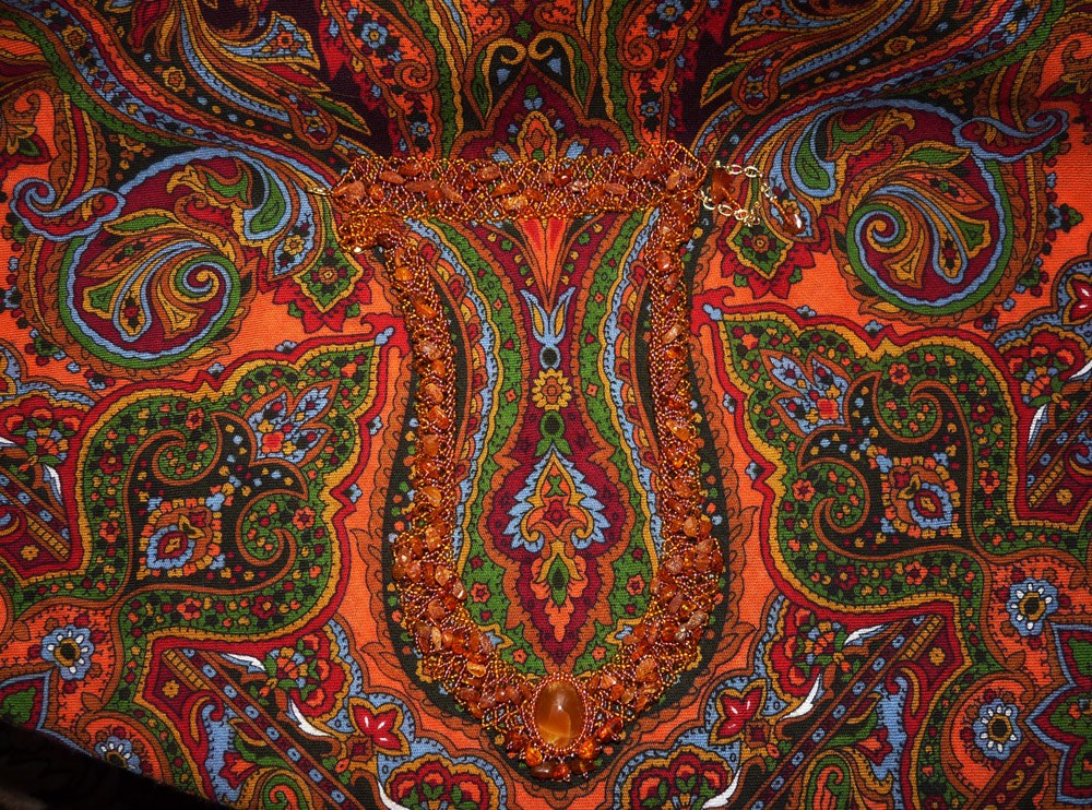 Давно хочу янтарное что-нибудь, но по разным причинам пока не судьба. Зато есть вот такое плетеное из бисера колье с янтарем и др камешками в тон