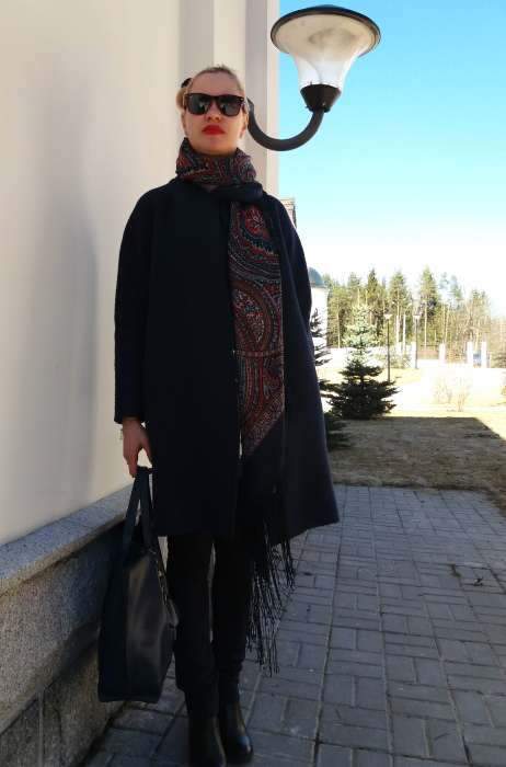 Бахрома остается внутри,видна только на концах.Шаль наматываю на шею шарфом,один конец намного длиннее другого.Короткий прячется под пальто. Это пальто как раз очень удачное,в нем совсем нет воротника.Фото под катом,так как качество не очень.