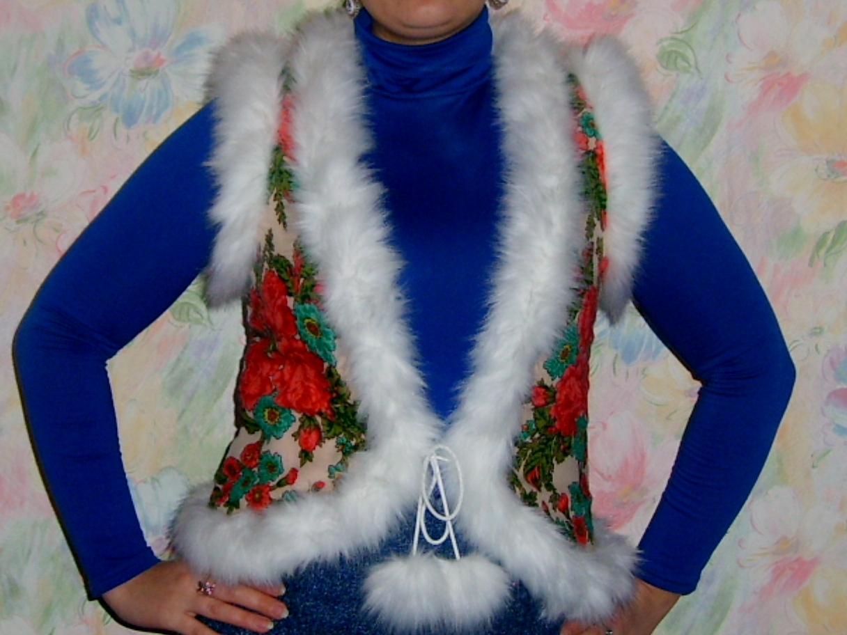 Я тут новенькая,недавно для себя открыла Павлопосадские платки.Люблю шить,поэтому решила сшить себе жилет.Купила платок"Южная ночь".Он такой красивый(мой любимый цвет синий),а резать стало жалко. ^V^ Решила для начала потренироваться на старом платке(из маминых запасов) .