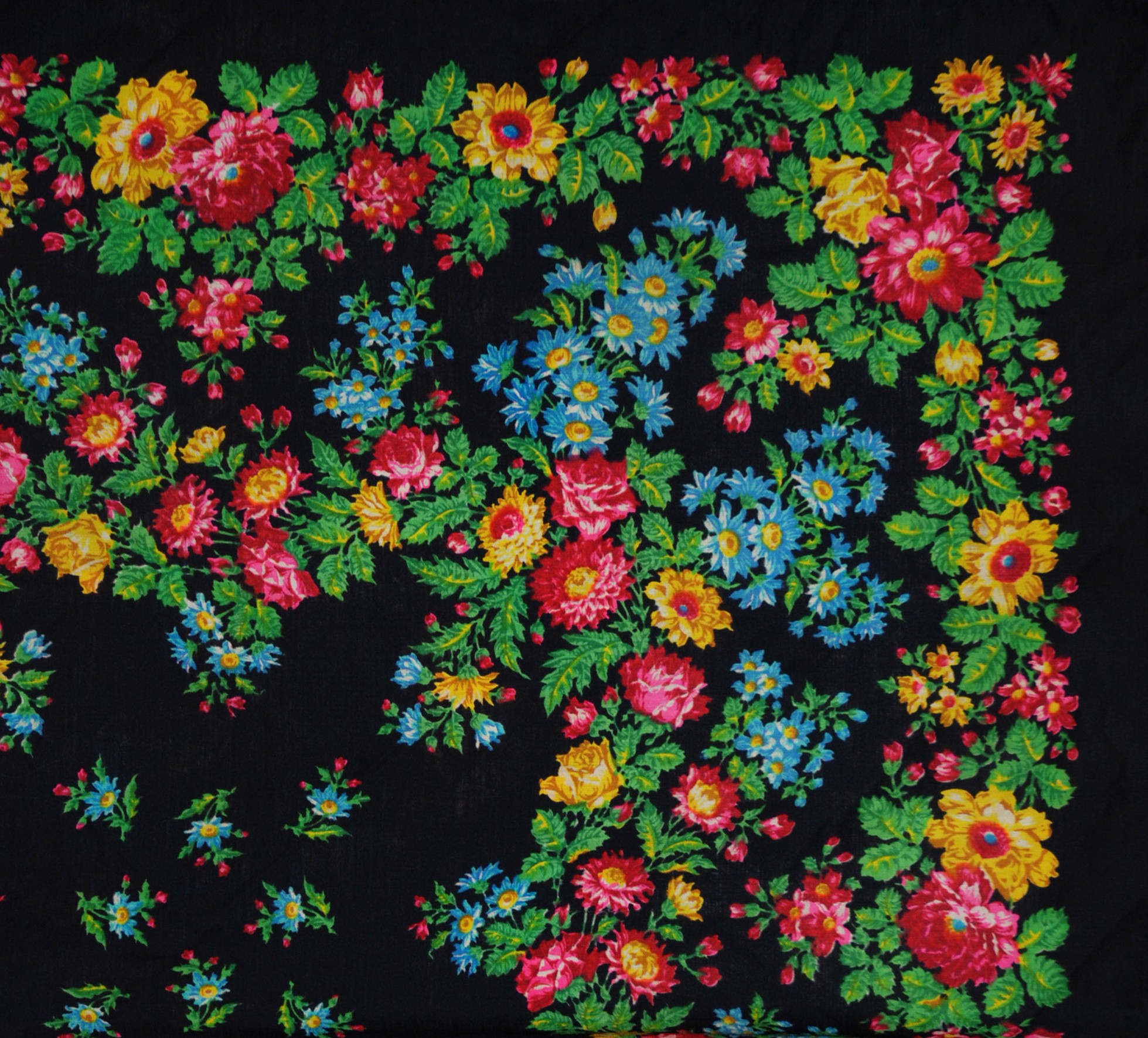 Шаль 130х130 с цветочным мотивом с розами, маками и ирисами