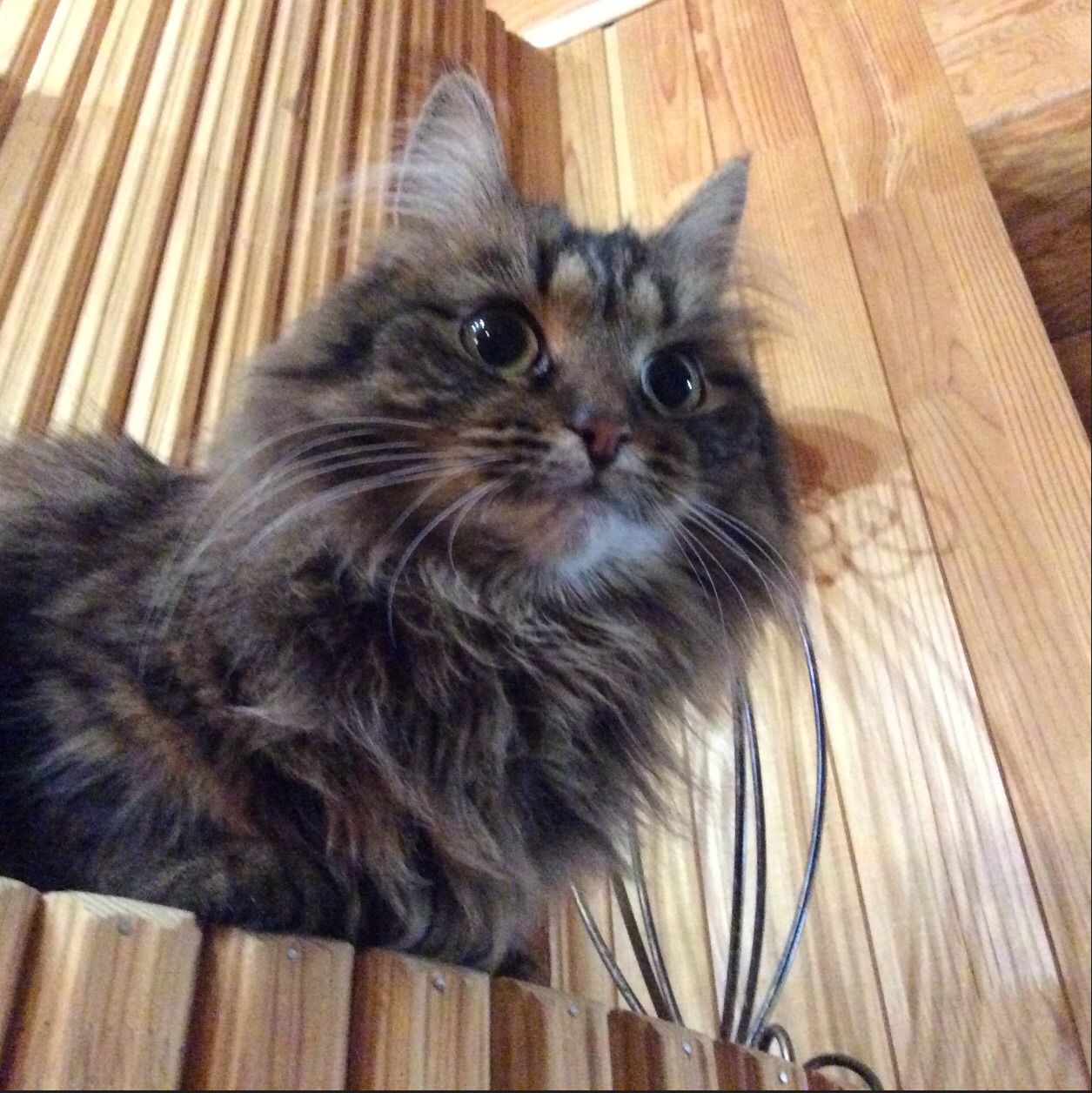 Шаль оправдывает свое имя: проявила неподдельный интерес к шалям. Немедленно залезла в открытый шкаф с шалями. Будучи изгнанной оттуда, дежурила у шкафа в ожидании его открытия. А потом носилась с Обамкой по комнате. Это выглядело вот так. А Савушка застыл в удивлении...