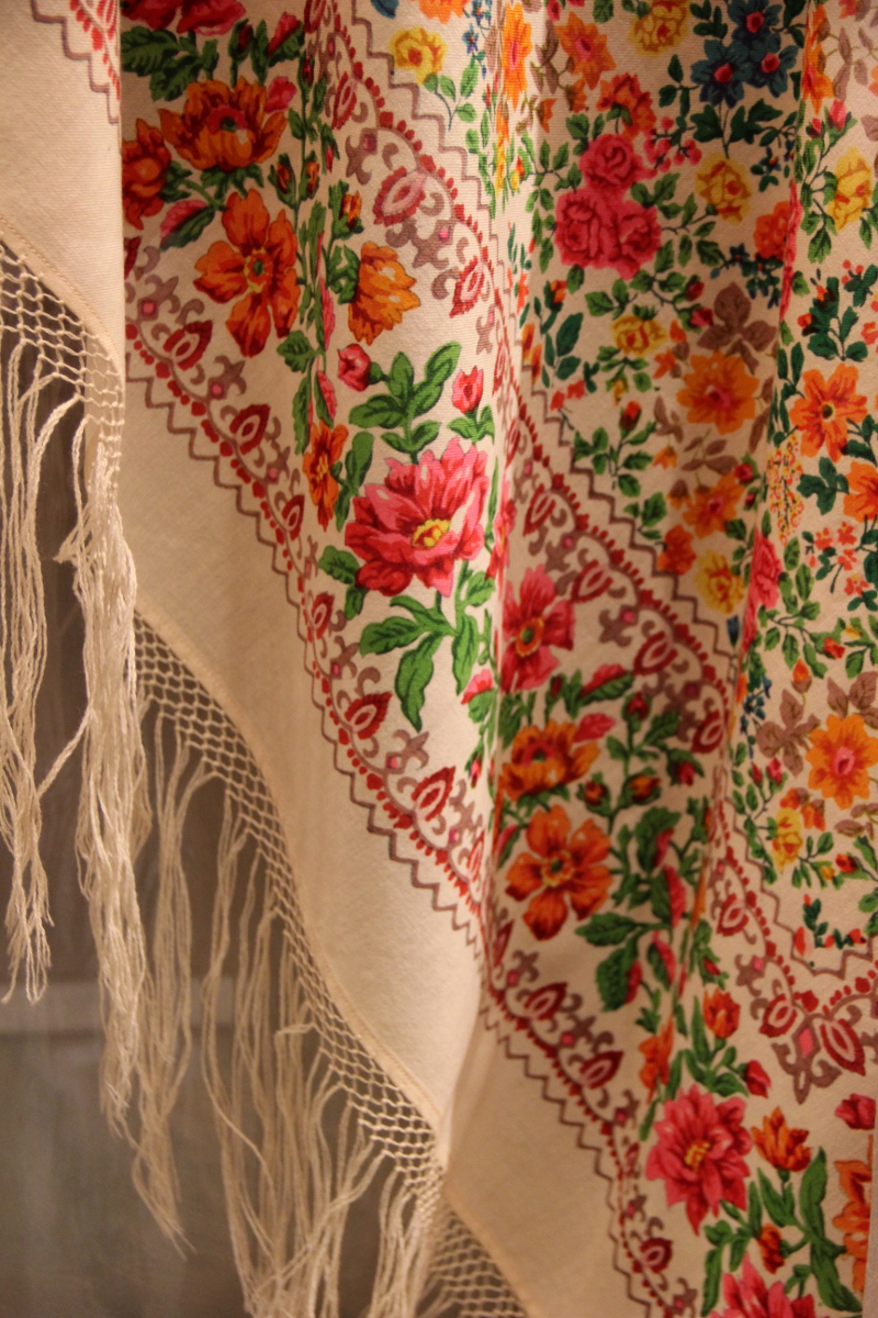 argon писал(а): Шаль порядка 150х150. Шерсть. Информация об этой шали публиковалась в кн. Макаровской. Считается, что это – рисунок 1950-х годов. Тогда же набивалась вручную. Отличается от шали Нежность лишь средником: в данном случае он традиционный, заполнен редкими штампочками-розочками. Кайма и средник красные, фон цветочой рамки оранжевый.