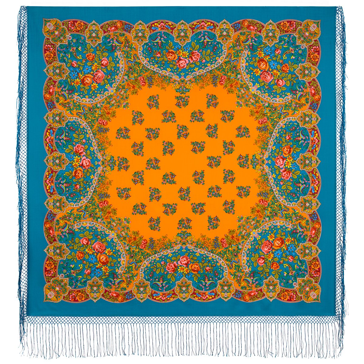 argon писал(а): Шаль 150х150. Шерсть. Информация об этой шали публиковалась во множестве источников, в частности, – в обоих альбомах Толстухиной и Полосиновой, в кн. Баровского, Макаровской, Рудина. Считается, что это – рисунок 1950-х годов, лишь Рудин указывает 1940-й. До 1960-х годов набивалась вручную. Известны (мне и на момент написания) 4 колорита: красный с бордовыми медальонами, оранжевый с желтыми медальонами, бирюзовый и зеленый.