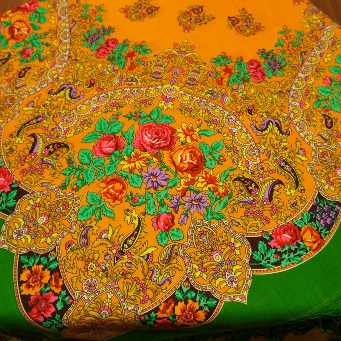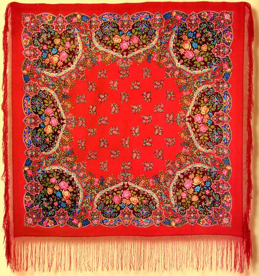 argon писал(а): Шаль 150х150. Шерсть. Информация об этой шали публиковалась во множестве источников, в частности, – в обоих альбомах Толстухиной и Полосиновой, в кн. Баровского, Макаровской, Рудина. Считается, что это – рисунок 1950-х годов, лишь Рудин указывает 1940-й. До 1960-х годов набивалась вручную. Известны (мне и на момент написания) 4 колорита: красный с бордовыми медальонами, оранжевый с желтыми медальонами, бирюзовый и зеленый.