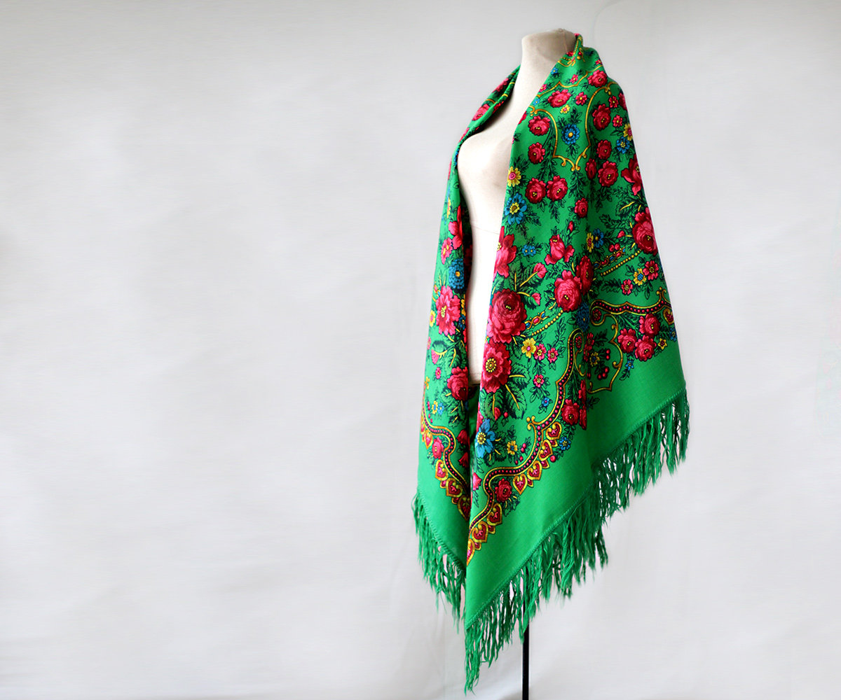 «У меня он поначалу «Cлавянкой» назывался, – говорит Ирина Петровна. – А родился так. Году в 65-м поехали мы в Минск – делать зарисовки национальных костюмов и вышивок. И на Яблочный Спас попали в одно село. Церковь, зеленый луг перед ней, и все люди в национальных костюмах, а женщины – в старинных платках. Зеленых, белых, красных. Нас так гостеприимно приняли, яблок надавали, бубликов, пряников. Одна бабушка к себе водила, показала старинные платки, штук 7 в сундучке. Рассказала, что эти платки передаются от бабок внучкам, а когда девушка выходит замуж, должна в приданом иметь несколько платков. У них как раз одна выходила, и они спросили, не можем ли мы прислать платки. А у нас тогда в магазинах невозможно было купить, все отправляли по республикам. От того хорошего настроения у меня и родился платок «Славянка». Мне кажется, что-то я в нем нашла, какую-то черточку народную. А все потому, что красного цвета много, такой красивый, радостный цвет счастья, неслучайно национальные костюмы многих народов отделывают красным.