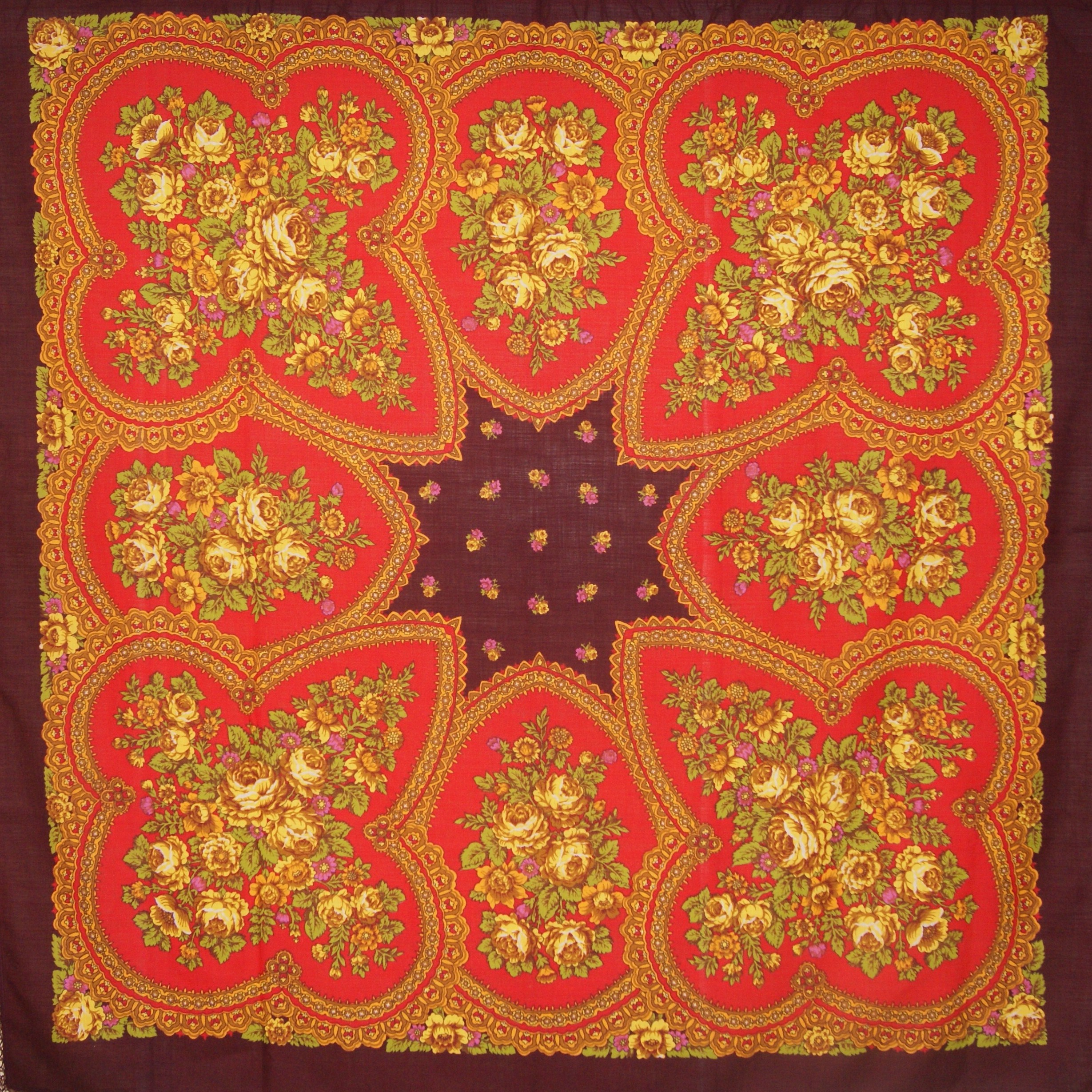 «У меня он поначалу «Cлавянкой» назывался, – говорит Ирина Петровна. – А родился так. Году в 65-м поехали мы в Минск – делать зарисовки национальных костюмов и вышивок. И на Яблочный Спас попали в одно село. Церковь, зеленый луг перед ней, и все люди в национальных костюмах, а женщины – в старинных платках. Зеленых, белых, красных. Нас так гостеприимно приняли, яблок надавали, бубликов, пряников. Одна бабушка к себе водила, показала старинные платки, штук 7 в сундучке. Рассказала, что эти платки передаются от бабок внучкам, а когда девушка выходит замуж, должна в приданом иметь несколько платков. У них как раз одна выходила, и они спросили, не можем ли мы прислать платки. А у нас тогда в магазинах невозможно было купить, все отправляли по республикам. От того хорошего настроения у меня и родился платок «Славянка». Мне кажется, что-то я в нем нашла, какую-то черточку народную. А все потому, что красного цвета много, такой красивый, радостный цвет счастья, неслучайно национальные костюмы многих народов отделывают красным.