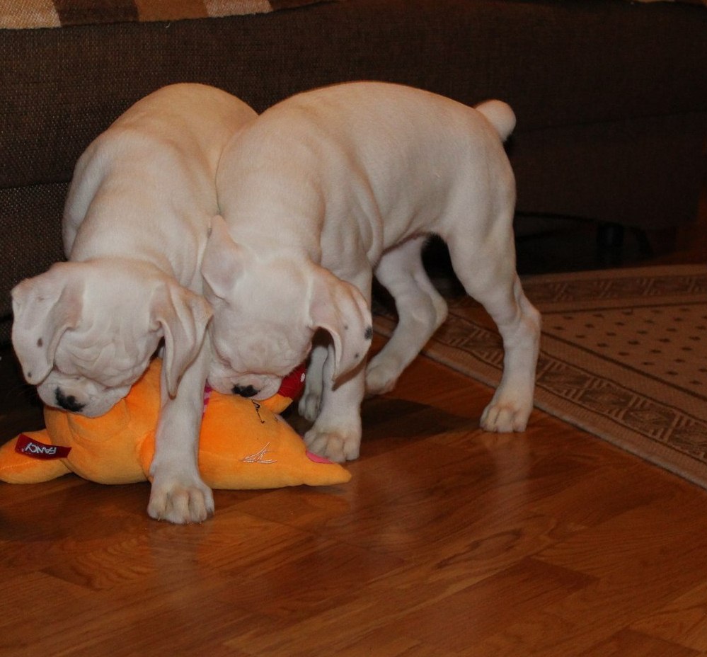 ALLA OK.- да, Марфуша тоже дочь Тильды, всего родилось 8 щенков, из них две беленькие девочки. В России и Европе боксеры этого окраса к дальнейшему разведению не допускаются, признает их только американский клуб, если я не ошибаюсь. Внешность, конечно, особенно у щенков- умилительная, но характер настоящий боксерский- веселый и куражный ))