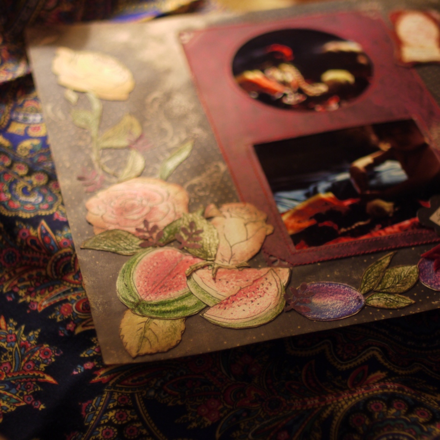 Тут бумага была совсем простая, даже блеклая. На акварельной бумаге нарисовала в детском ключе розы и фрукты, наклеила - все это к сюжету страницы: верхняя ,в круглой рамке фотография чудесный натюрморт (фотоаппарат у меня всегда под рукой и мне нет никакой возможности оставить без увековеченья прекрасные розы, которые каждый день кто-то да приносит, и которые каждый раз складываются в какую-нибудь композицию - ну не могу я пред ними устоять!)