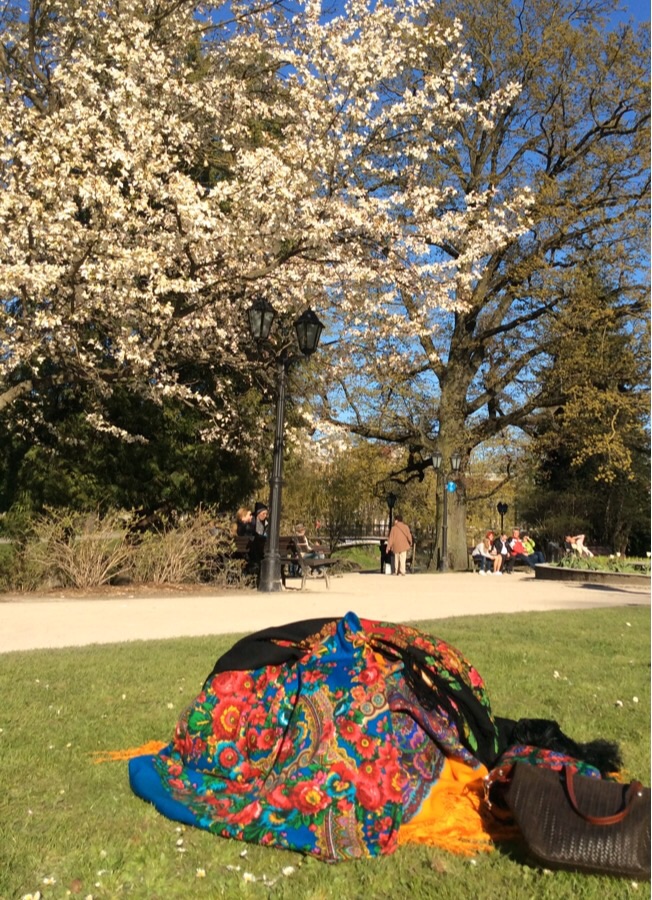 Фото шалек на заветных скамеечках в этот раз не будет, скамеечки все были заняты обалдевшими от яркого солнечного дня рижанами и гостями города. Поэтому мы вольготно расположились на лужайке у Оперного театра.