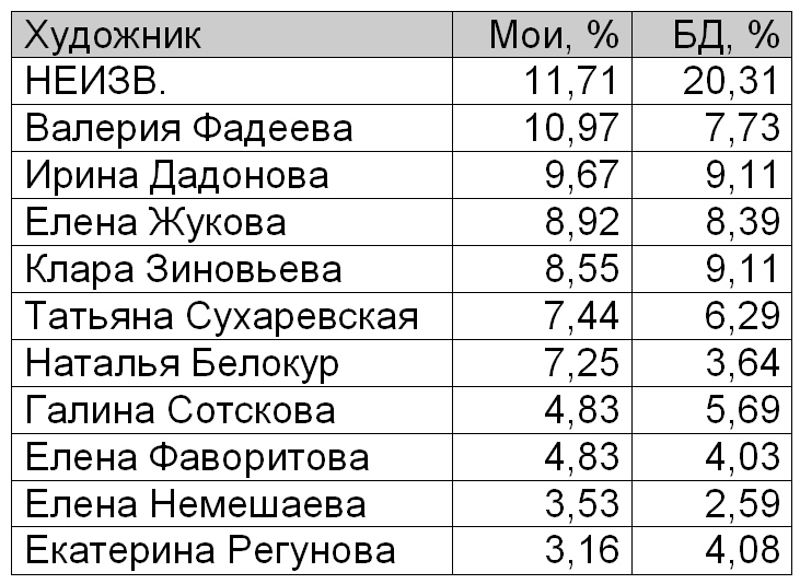 Данные по всем художникам (кроме двух) в моей коллекции и в БД более-менее соответствуют друг другу. Т.е. неправильно было бы говорить, что Галину Сотскову я люблю меньше, чем Ирину Дадонову, например. Незначительные расхождения в плюс или в минус ничего не выражают.