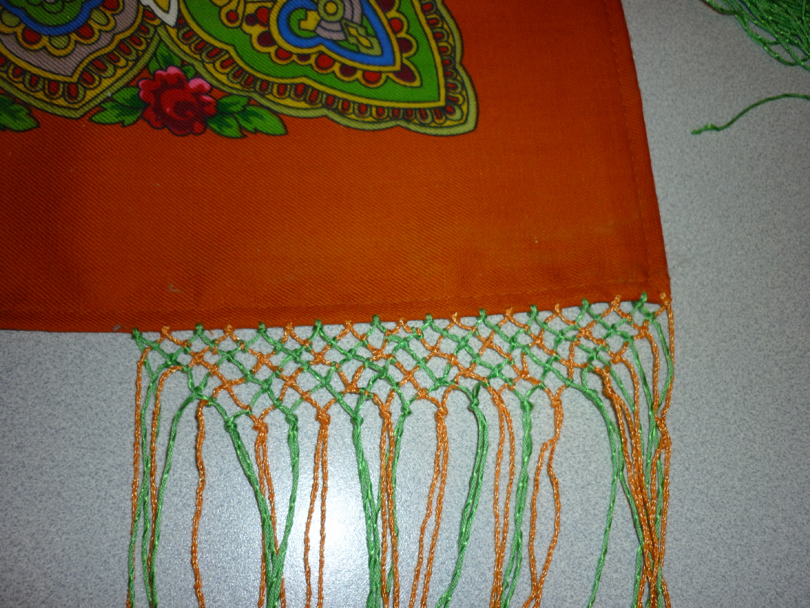 Сделала бахрому на лоскут от 30 "Счастливицы". Шаль эту хотела давно, но - возьму в магазине - нравится, к лицу - идёт, а кайма иззелена-черного цвета - тормозит. Как в траурной рамочке красота!