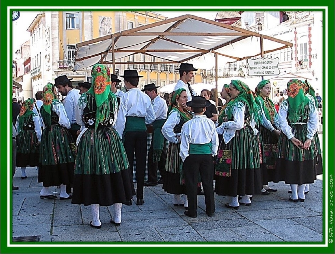 В материале о костюме Vianesa - коллаж из 5 фото и пояснение: «Очень известный костюм, который вот уже более 100 лет носят девушки из деревень округа Виана-ду-Каштелу. Этот красочный и столь типичный костюм – традиционный символ региона.»
