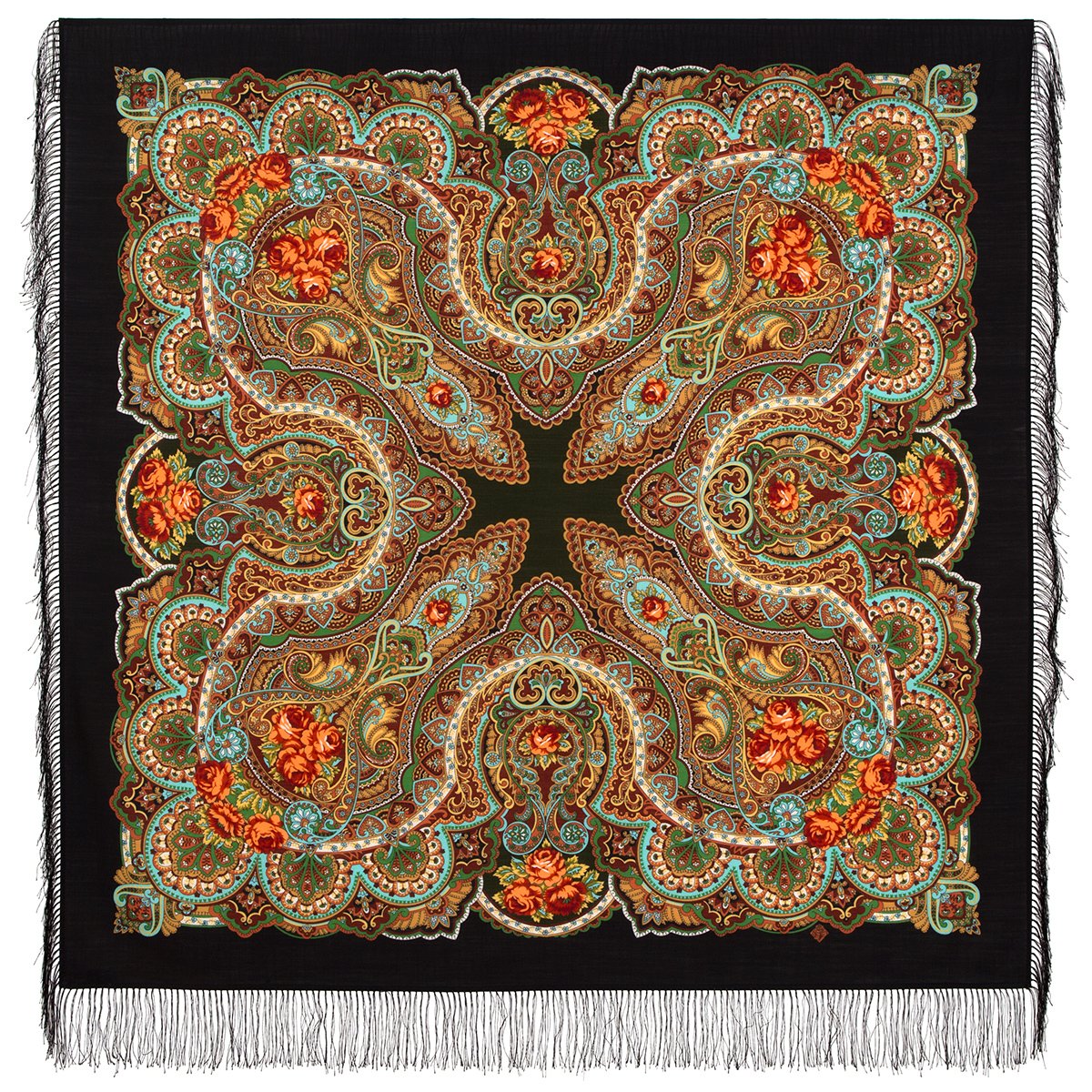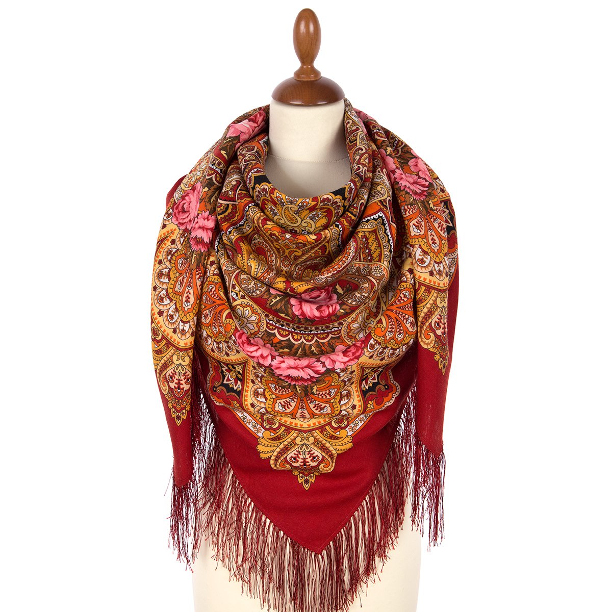 Кайма платка красная. Рисунок выполнен в золотистых, оранжевых, красных, розовых тонах с добавлением черного цвета.