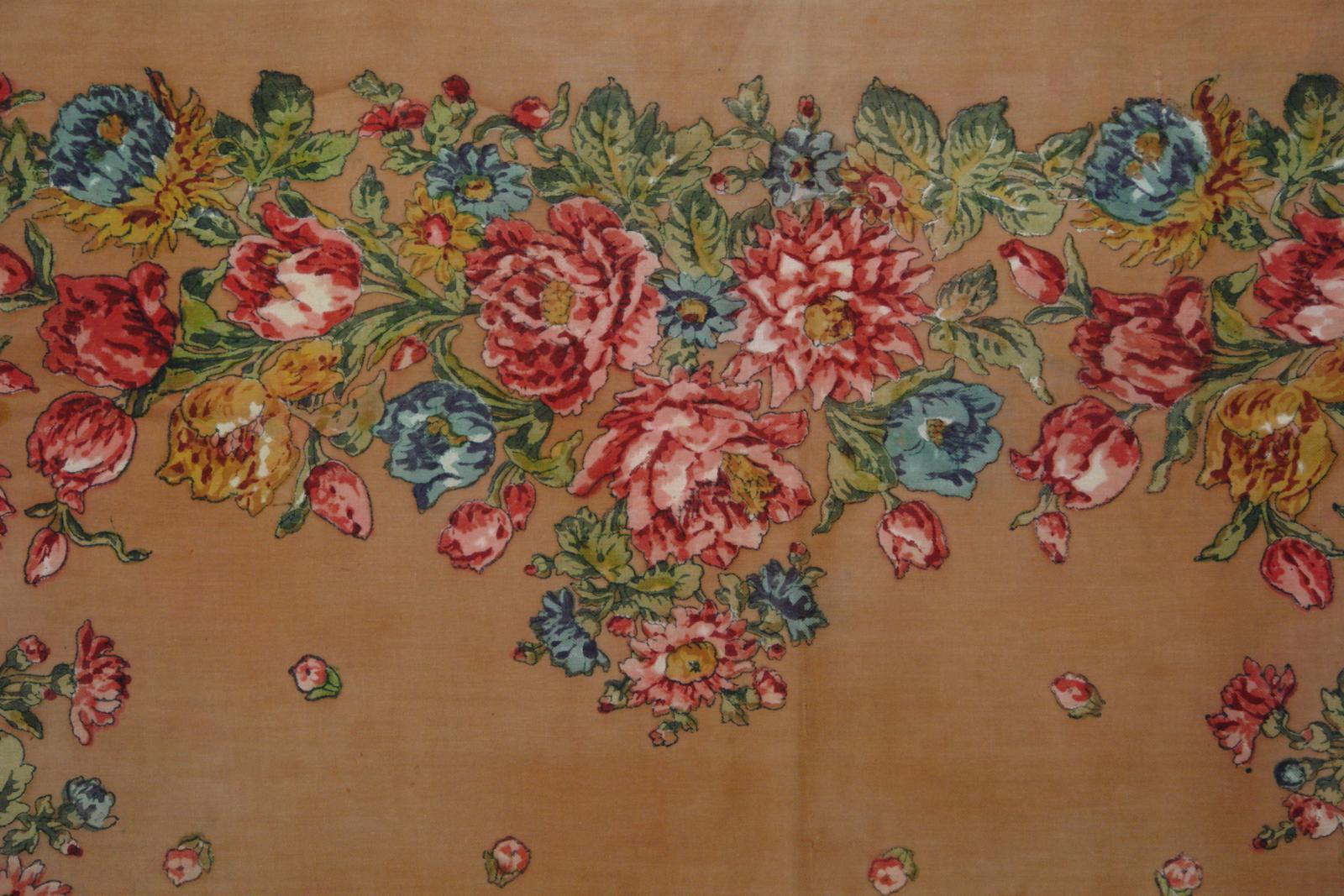 Время печати точно определять не возьмусь, так как попала шаль ко мне в руки в плачевном состоянии. Даже не так, вообще без состояния. Если бы не очевидность ручной набойки, я не стала бы ею заниматься. И ещё предположение, что шаль всё-таки довоенная...