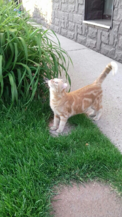 Первые выходы были весьма неудачные - он вел себя никак все предыдущие коты. Как только его опускали на траву, он ничем не интересовался, сразу орал и бежал куда то не разбирая дороги. Мы не могли понять от чего орет - то ли от восторга, то ли от страха. Но, судя потому что он забился под бак с водой, поняли, что он очень трусит. Стали выгуливать на руках. Сидел, лупал глазами и молчал.