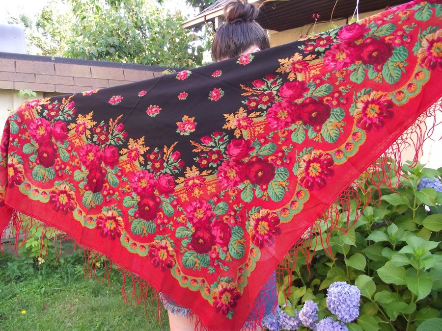Фотография фрагмента шали аналогичного рисунка в тёплом колорите