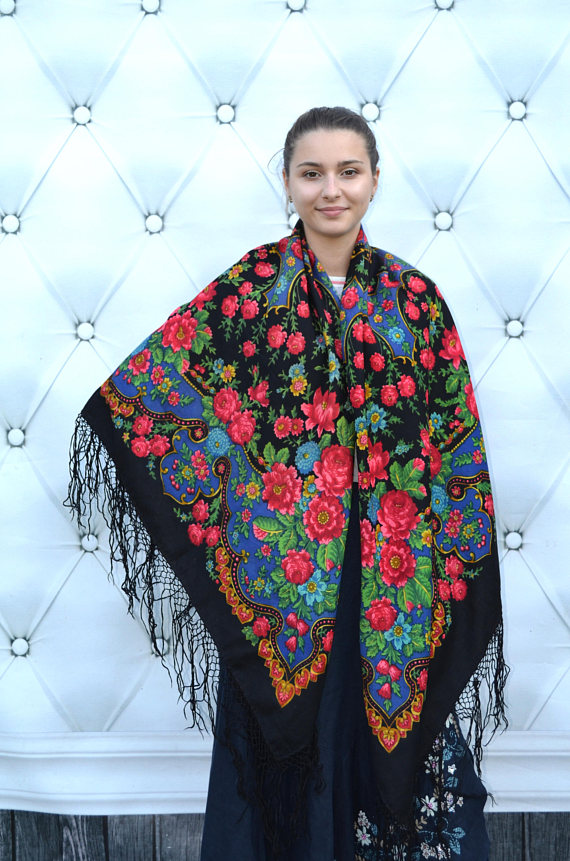 Шаль шерстяная, размер по информации продавца 146х132 см. По-моему, ручная набойка.