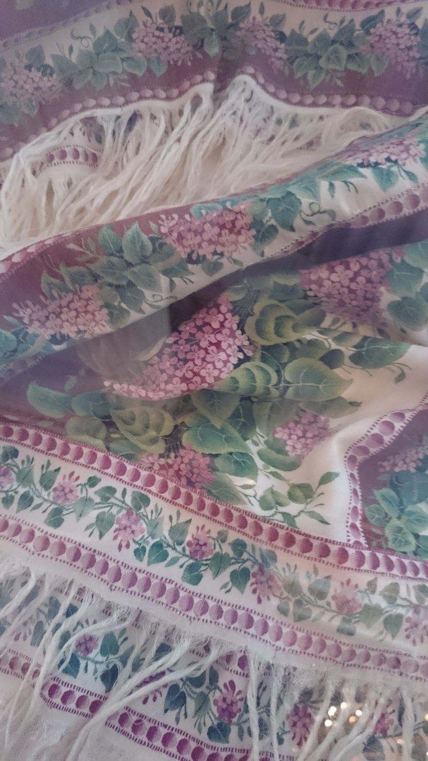 Выставка текстиля. Божественная большая шерстяная шаль 18 или 19 века, которая проходит через колечко, с нежнейшей сиренью.(Кликните, чтобы почитать оффтопик)...