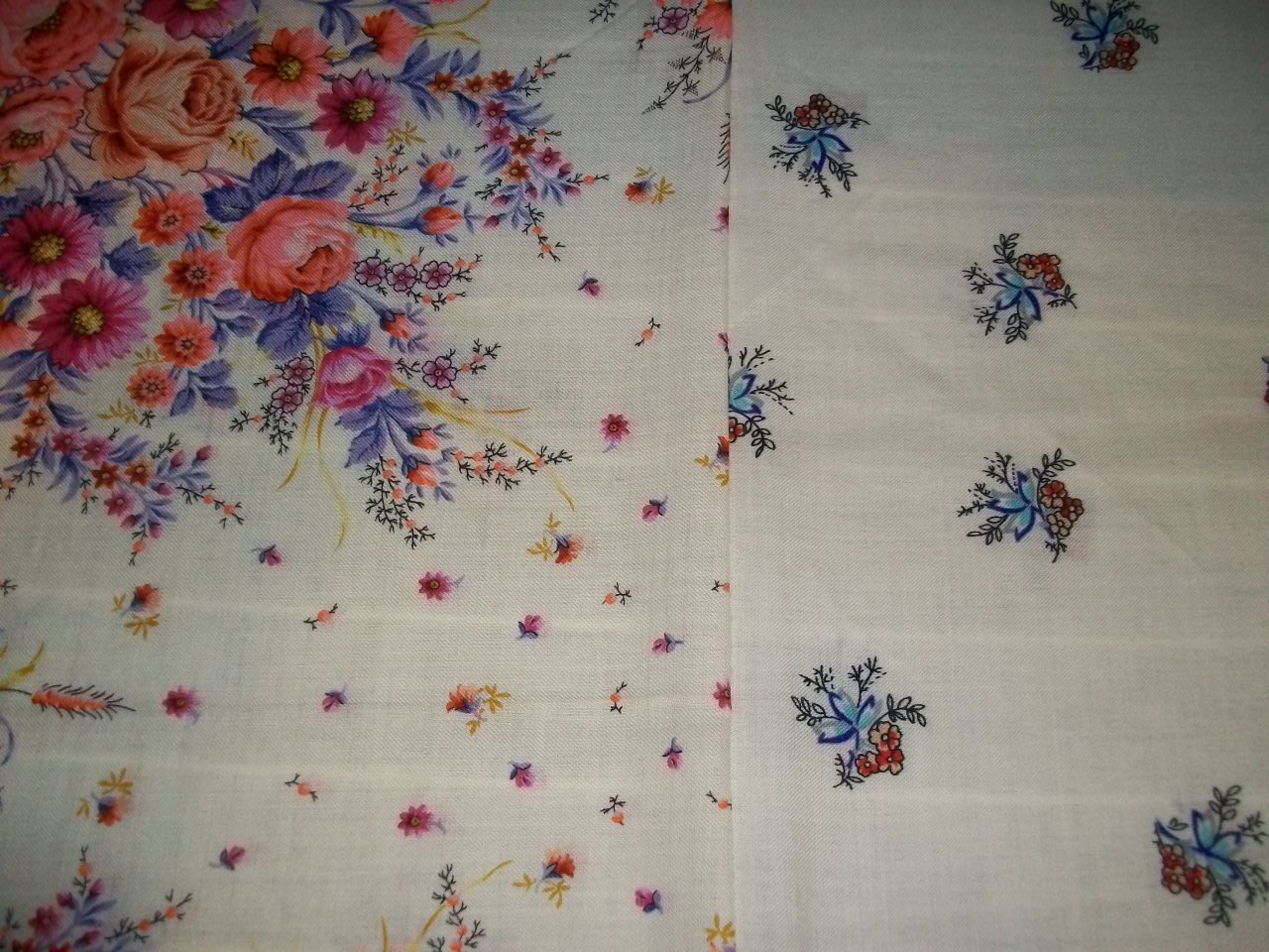 Не знаю видно ли это на мониторе но Малиновка явно желтее. Гжель (что на фото) была платком 1 сорта. Бахрома была снята, кайма заужена.
