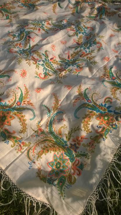 В разделе "Помогите опознать" выкладывала фото платка чернопольного ассиметричного рисунка. Этот платок украинского производства 1975-77 г. выпуска.