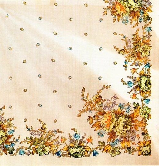 Natasik писал(а):Получила на днях винтажный платочек из Харькова. Рисунок идентифицирован как современный "Вечерний" или старинный "Осенний". Никаких этикеток не сохранилось, бывшая владелица сообщила, что платок примерно 1955 года приобретения...