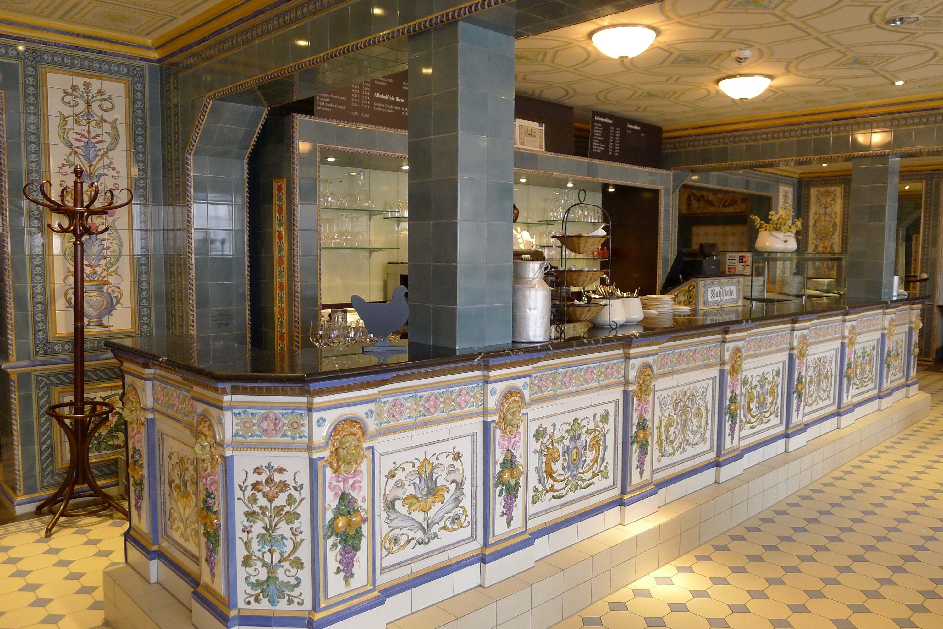 Тень на песке 1084-0 Елены Немешаевой в воссозданном интерьере Cafe de Paris с керамической плиткой и посудой Villeroy & Boch