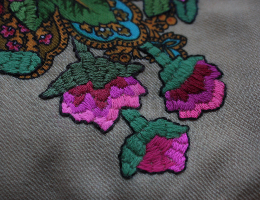 В один не очень прекрасный момент я обнаружила, что на любимом домашнем платке в одном из углов появилось несколько дырочек и потертостей. Могу только догадываться, откуда взялась эта россыпь, но решила я эту проблему кардинально: сначала заштопала дырки, а потом замаскировала это все вышивкой, дополнив кое-где композицию по целому полотну. Нитки - шерсть советская (розовые оттенки идеально подошли по яркости) и мулине, с обратной стороны флизелин.