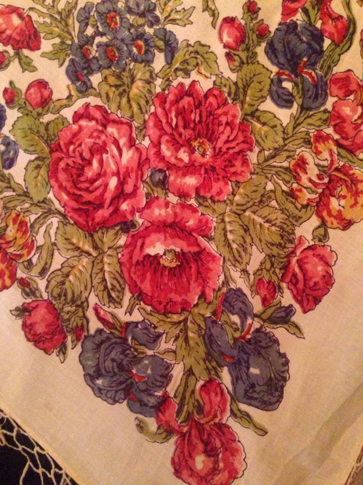 Платок интересный, на редкость целый и не ношен."покремовел" от времени(.Не хочется даже приводить в порядок, пусть так и сохраняется нетронутым моими руками, только временем, в компании " братьев" от Рыжова.