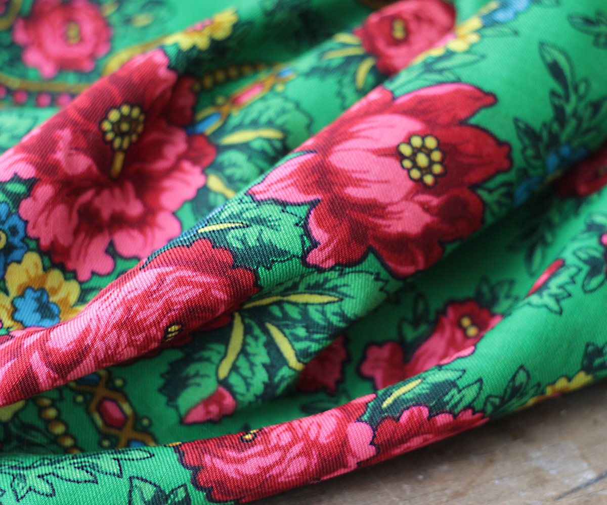 «У меня он поначалу «Cлавянкой» назывался, – говорит Ирина Петровна. – А родился так. Году в 65-м поехали мы в Минск – делать зарисовки национальных костюмов и вышивок. И на Яблочный Спас попали в одно село. Церковь, зеленый луг перед ней, и все люди в национальных костюмах, а женщины – в старинных платках. Зеленых, белых, красных. Нас так гостеприимно приняли, яблок надавали, бубликов, пряников. Одна бабушка к себе водила, показала старинные платки, штук 7 в сундучке. Рассказала, что эти платки передаются от бабок внучкам, а когда девушка выходит замуж, должна в приданом иметь несколько платков. У них как раз одна выходила, и они спросили, не можем ли мы прислать платки. А у нас тогда в магазинах невозможно было купить, все отправляли по республикам. От того хорошего настроения у меня и родился платок «Славянка». Мне кажется, что-то я в нем нашла, какую-то черточку народную. А все потому, что красного цвета много, такой красивый, радостный цвет счастья, неслучайно национальные костюмы многих народов отделывают красным.