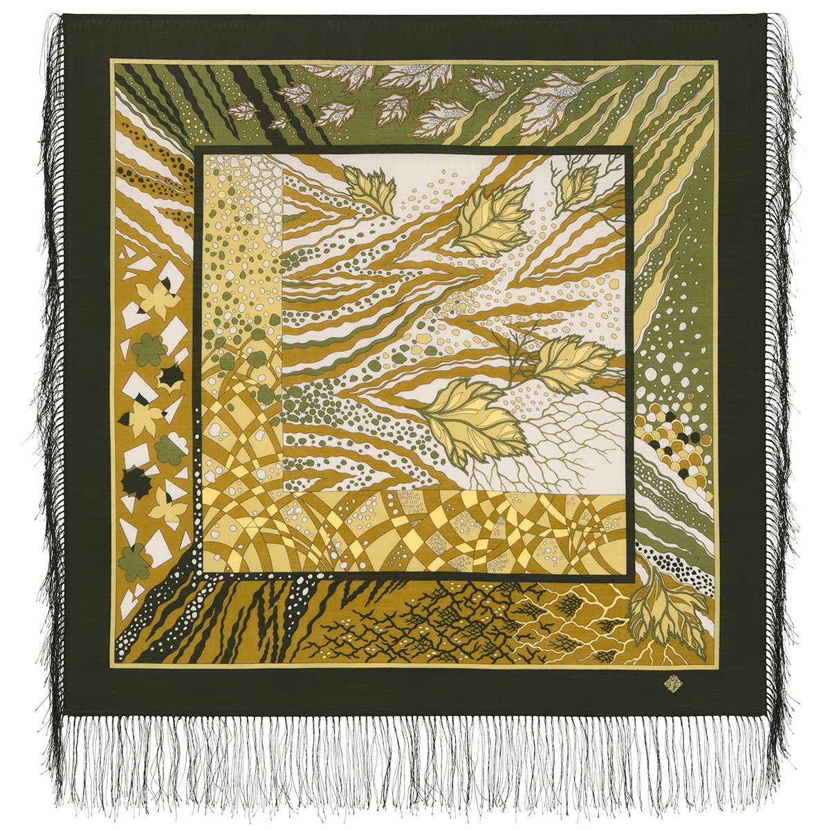 903-10 Кайма платка темно-оливковая. В рисунке присутствуют бежевые, золотистые, оливковые и серые тона.